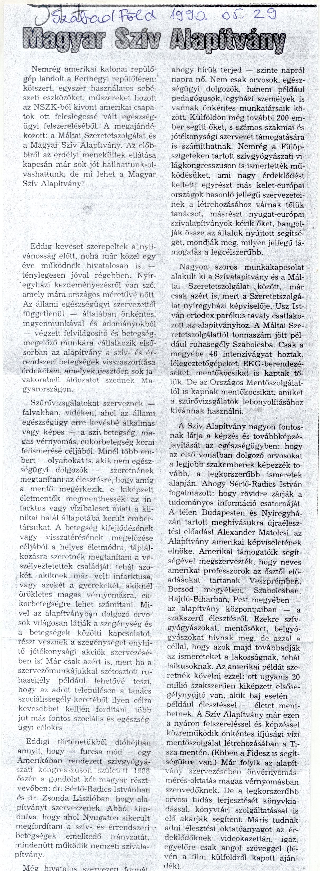 Magyar Szív Alapítvány_Szabad föld 1990.05.29