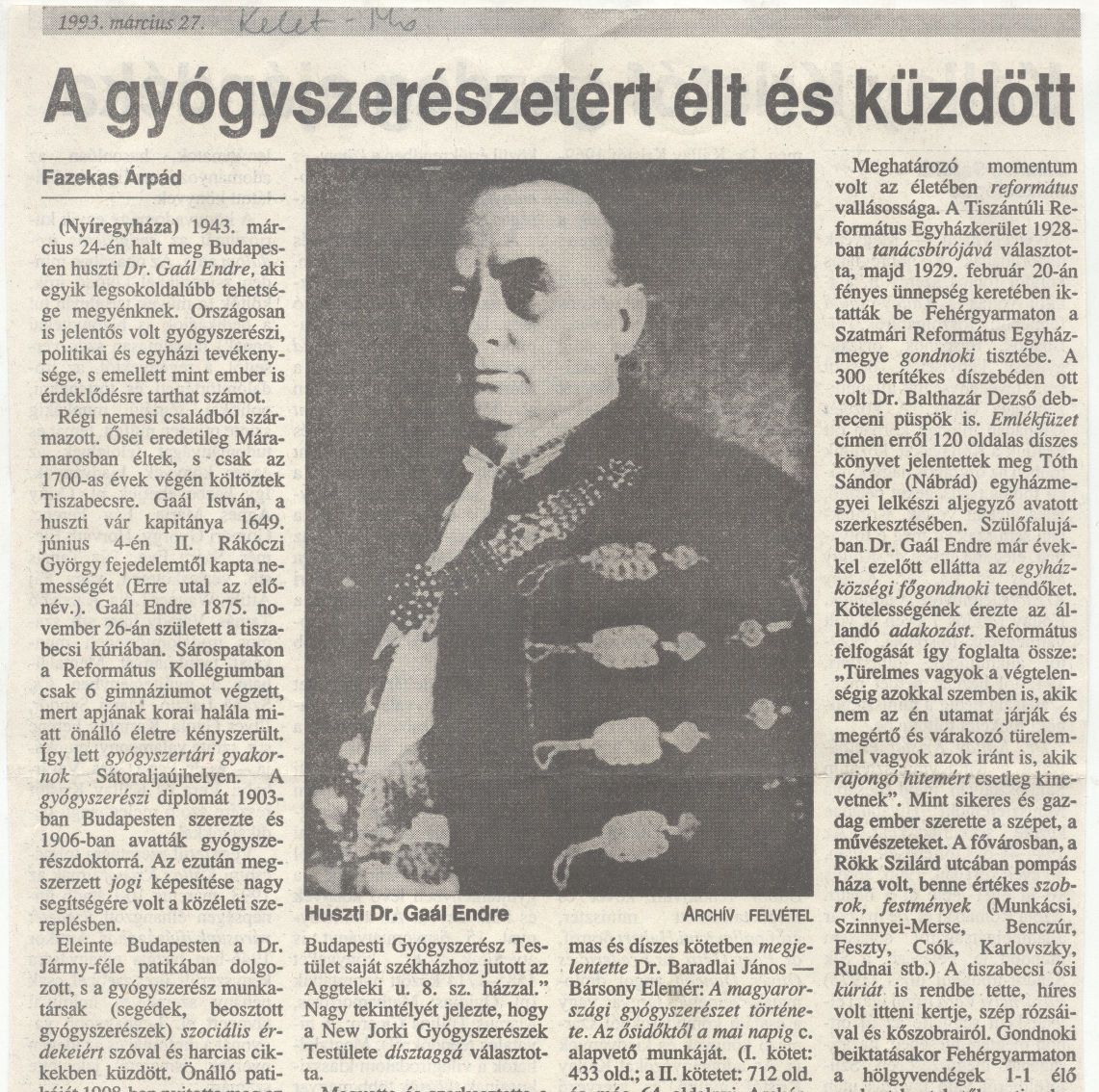 A gyógyszerészetért élt és küzdött_KM 1993.03.27