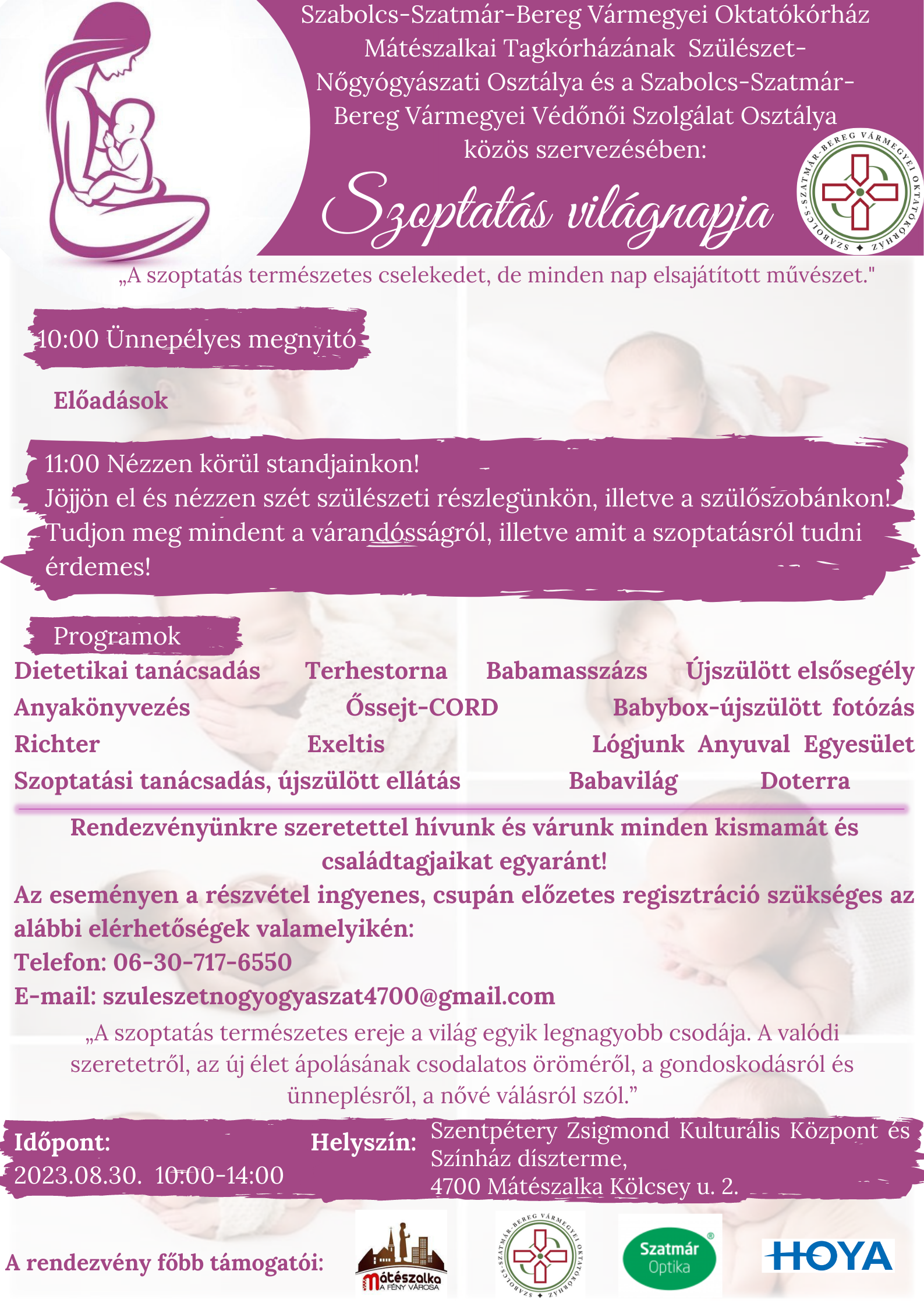 A Mátészalkai Tagkórház Szülészet-Nőgyógyászati Osztálya és a Szabolcs-Szatmár-Bereg Vármegyei Védőnői Szolgálat Osztálya közös szervezésében, augusztus 30-án szeretettel várnak minden érdeklődőt a Szoptatás Világnapja című rendezvényen, Mátészalkán!