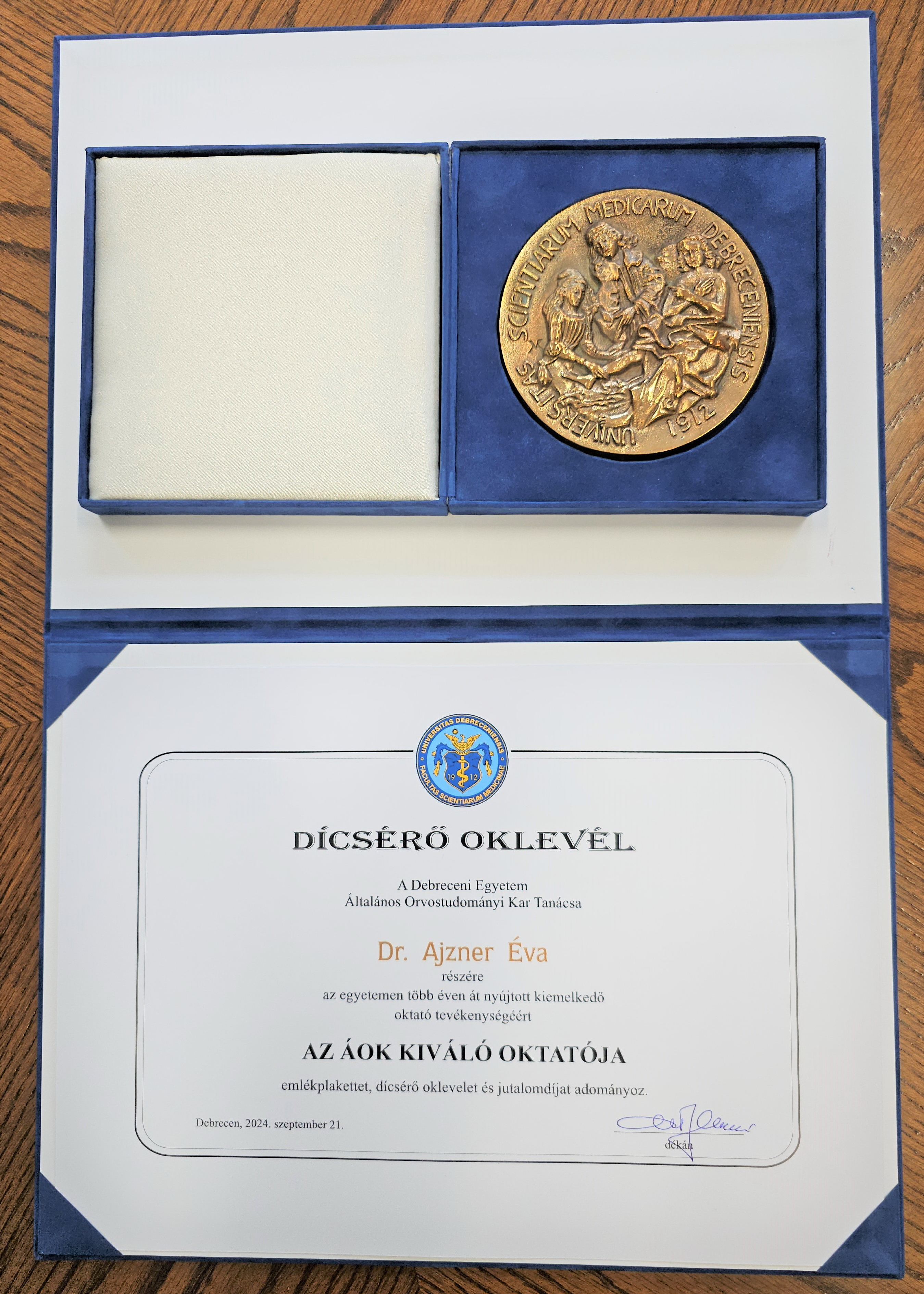 A díjat az Általános Orvostudományi Kar Kari Tanácsa és az ÁOK Tanulmányi Bizottsága javaslatára, oktatói munkásságáért, valamint intézményünk oktatókórházi tevékenységének elismeréseként vehette át Főigazgató Asszony, a Debreceni Egyetem orvosdoktor-avató ünnepségén.