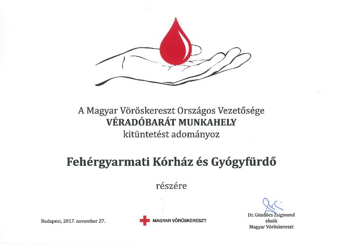 A Véradóbarát munkahely címet 18-an nyerték el, több vállalat és cég mellett a Fehérgyarmati Kórház és Gyógyfürdő is, amelynek képviseletében dr. Kovács Gábor telephelyi orvosigazgató-helyettes úr vette át a kitüntetést.